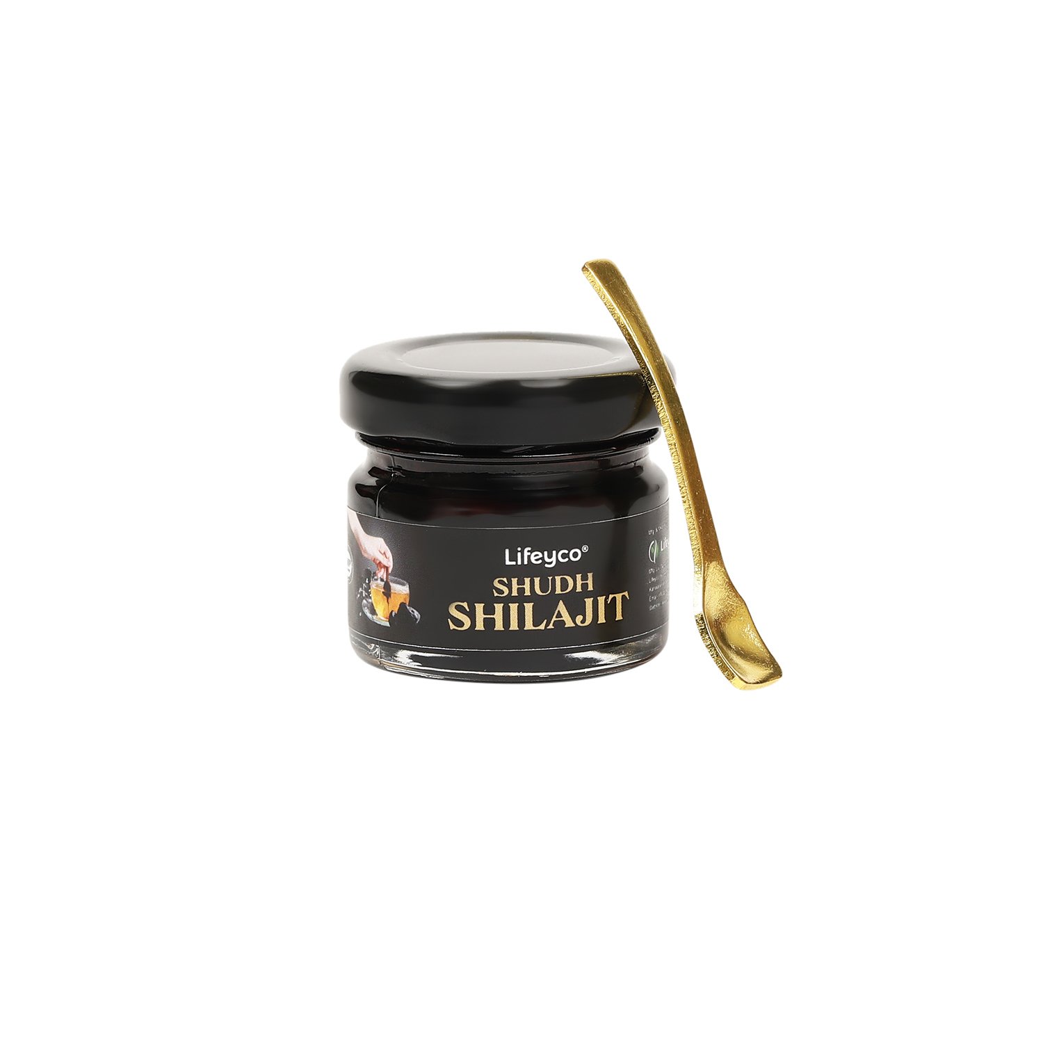 of Lifeyco Shuddh Shilajit Resin using the provided spoon.