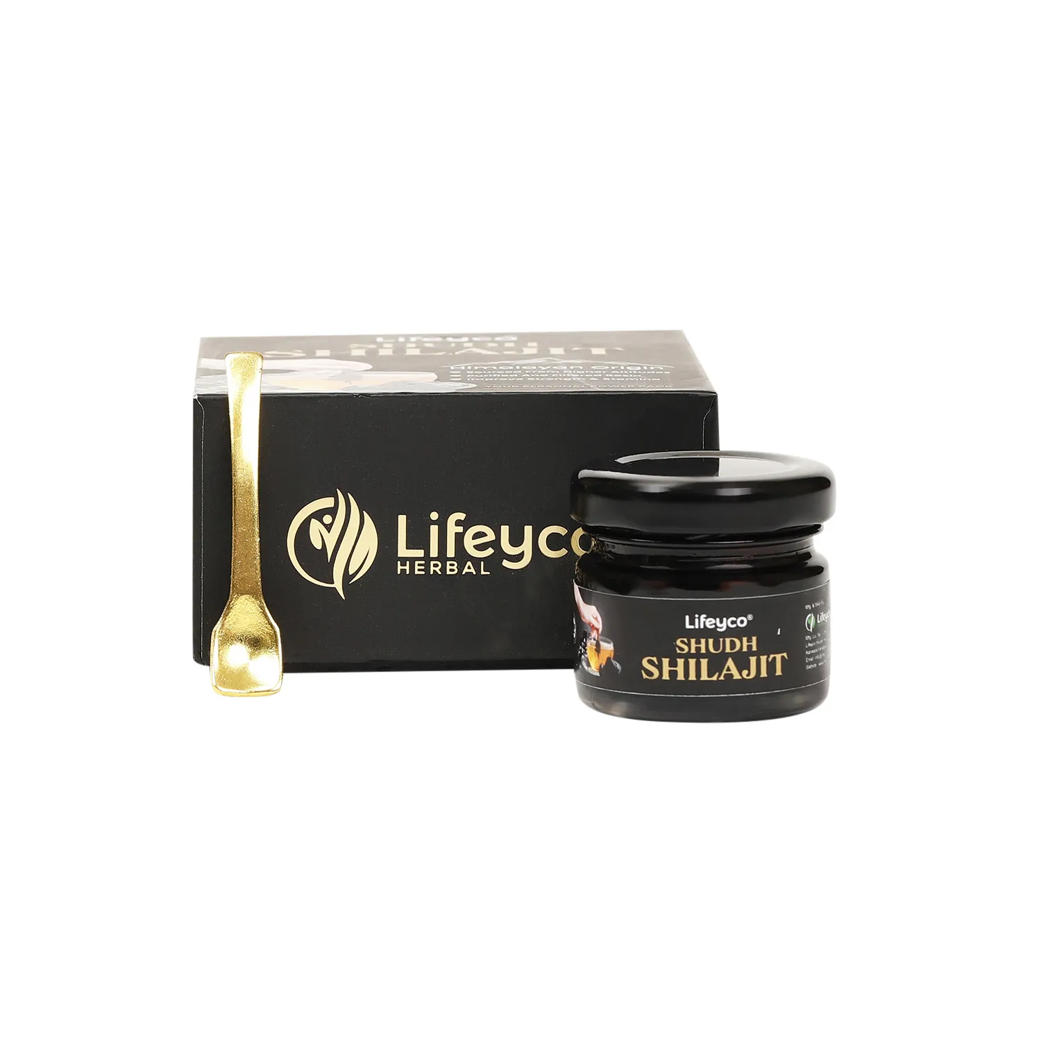 of Lifeyco Shuddh Shilajit Resin using the provided spoon.Dissolve in 100–200 ml lukewarm milk or water and stir well